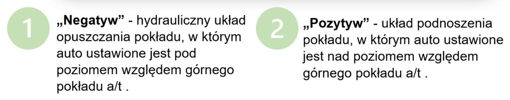 Środkowy układ unoszenia platformy górnego pokładu przyczepy – sterowany hydraulicznie w zakresie pracy góra-dół. Możliwe ustawienie pojazdu w pozycji „Negatyw”/„Pozytyw”