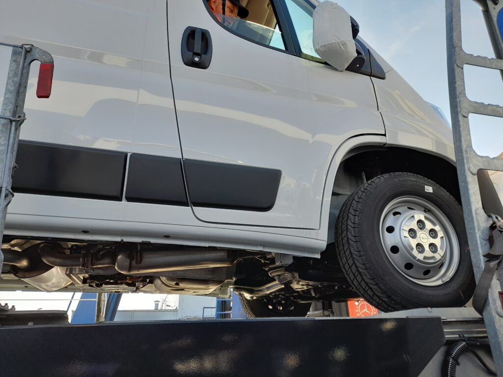 4. Obowiązkowo zabezpiecz 2 przednie koła wraz ze sztaplami, by uniknąć ewentualnego „podbicia” na wybojach w czasie transportu. Przykład prawidłowo zabezpieczonego koła i sztapla na zdjęciu