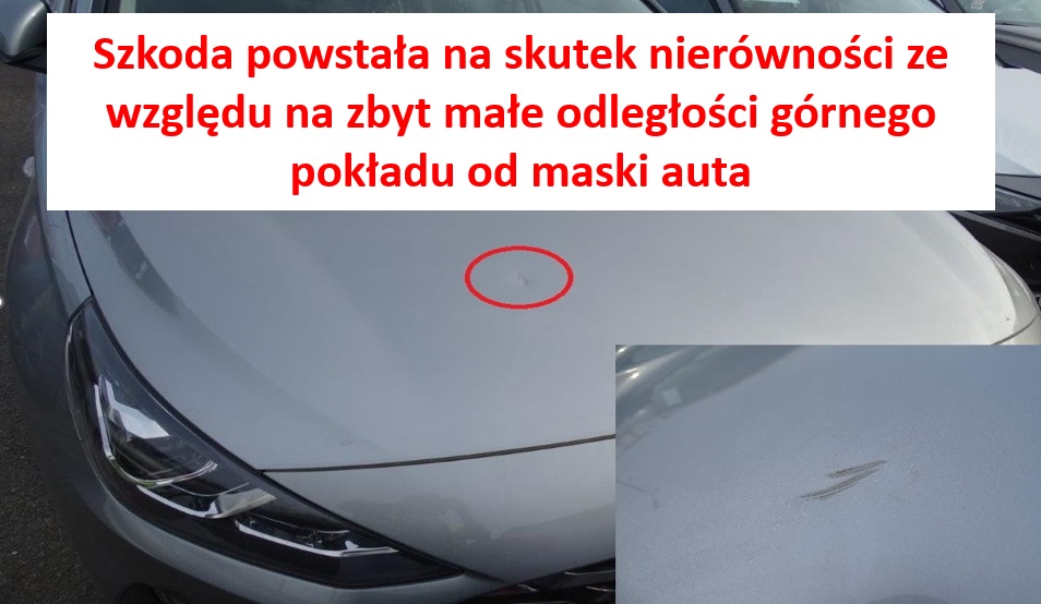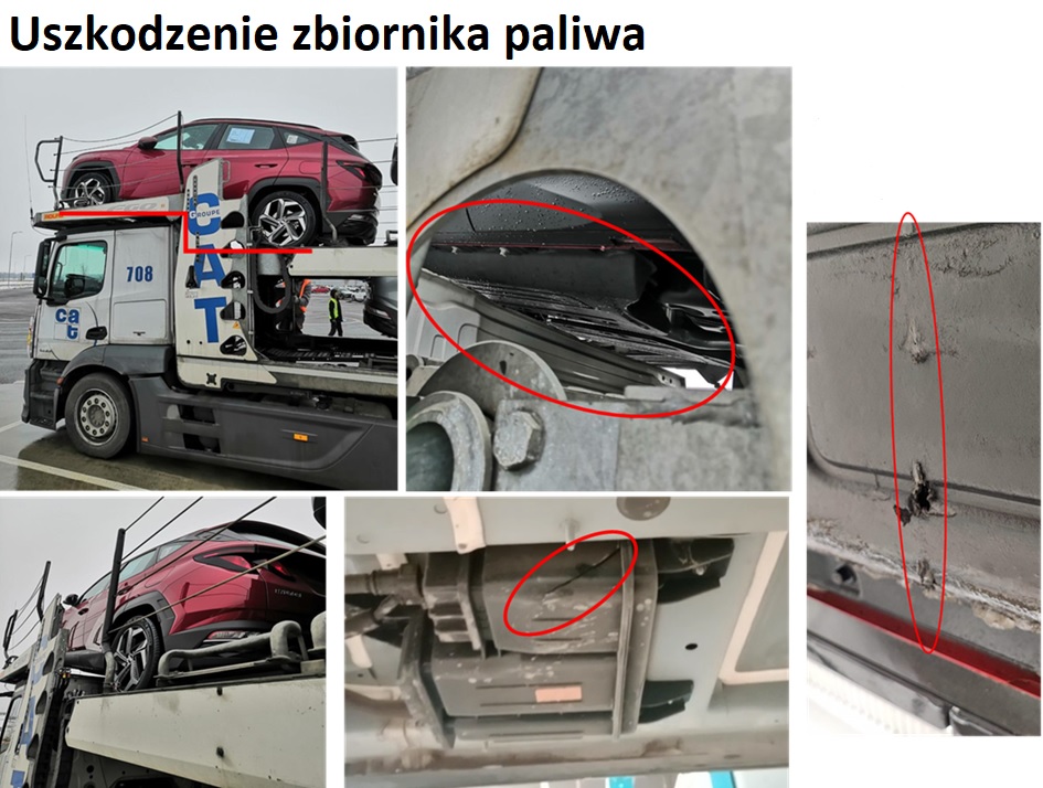 Jak Państwo wiedzą, podwozie samochodu nie jest standardowym obszarem kontroli podczas odbioru jakościowego samochodów w miejscu rozładunku, jednak po oględzinach stwierdzono, że uszkodzenia powstały w wyniku nieprawidłowego załadunku samochodów na autotransportery (pokład górny/pokład dolny). Jeśli odległość między zbiornikiem paliwa a konstrukcją ciężarówki nie jest wystarczająca, dochodzi do kontaktu i uszkodzenia zbiornika na skutek pracy zawieszenia samochodu w czasie transportu.