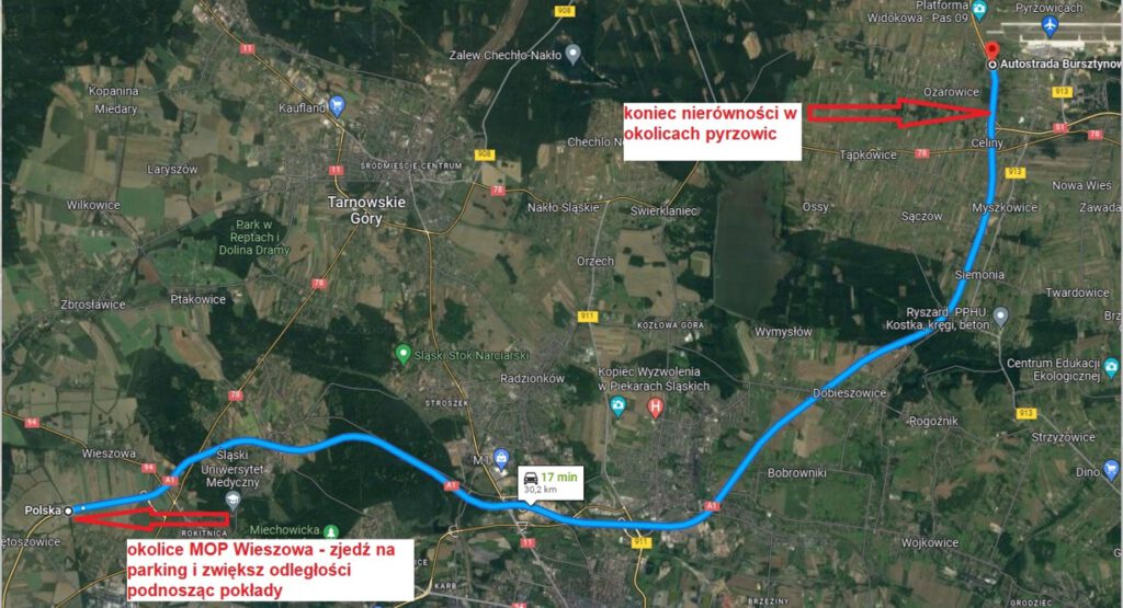 UWAGA: Jadąc Autostradą A1 w kierunku Częstochowy między Piekarami Śląskimi a Pyrzowicami na odcinku ok.30km od MOP Wieszowa aż do minięcia zjazdu na S1 w Pyrzowicach występują liczne uskoki na drodze mogące spowodować przemieszczenie ładunku i uszkodzenia z tym związane. Zapobiegnij uszkodzeniu przez zwiększenie odległości między pokładami oraz dachami pojazdów do co najmniej 15 cm oraz DOSTOSUJ ODPOWIEDNIO PRĘDKOŚĆ na wybojach.