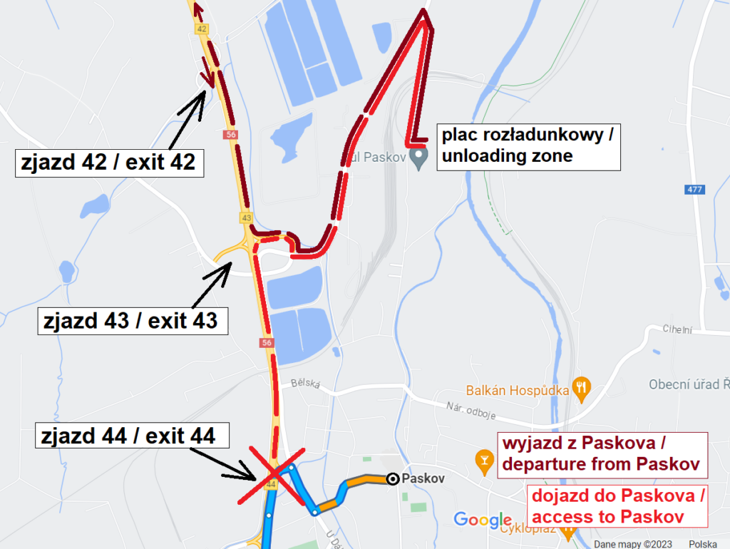 Po załadunku w Paskovie należy kierować się zjazdem nr 43 na drogę nr 56 w kierunku Ostrawy. Jadąc w kierunku Ostrawy można zawrócić zjazdem nr 42.