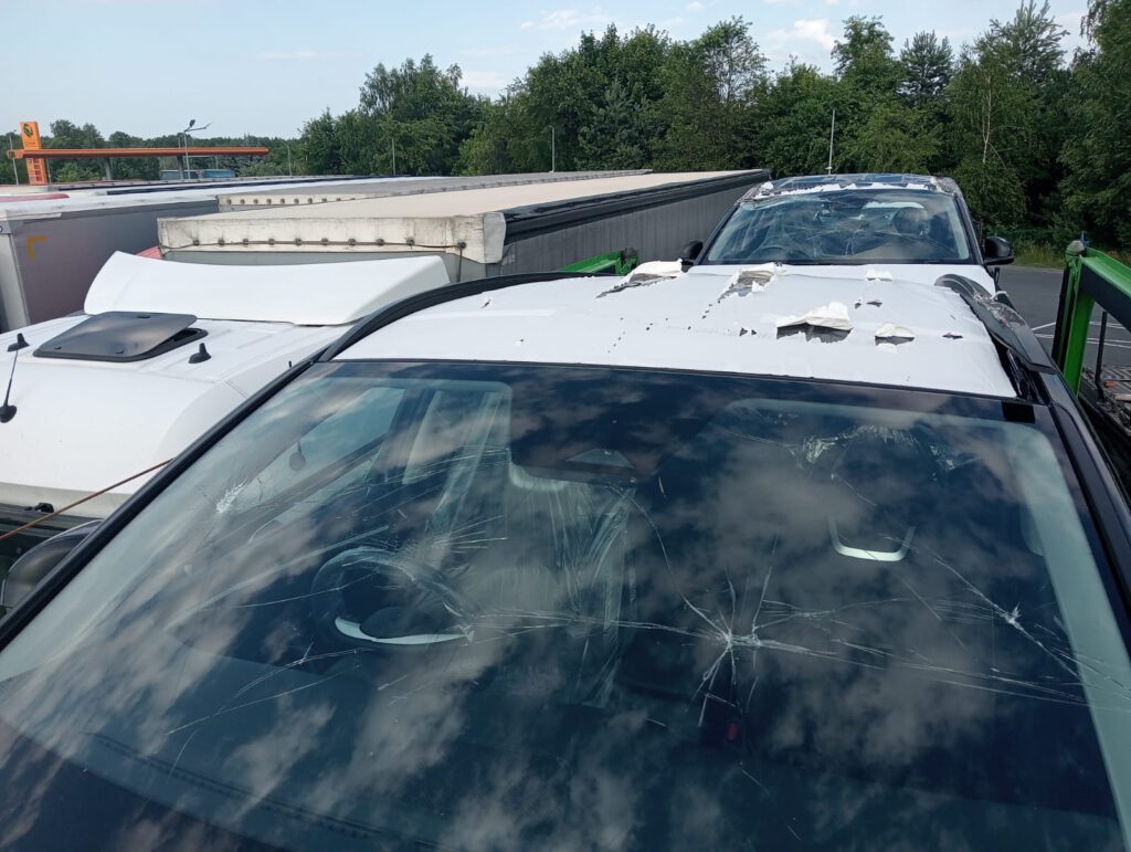 Zignorowanie przez kierowcę oznaczeń wysokości wiaduktu doprowadziło do poważnego uszkodzenia dwóch samochodów. Wysokość ładunku znacznie przekraczała wysokość 4m!