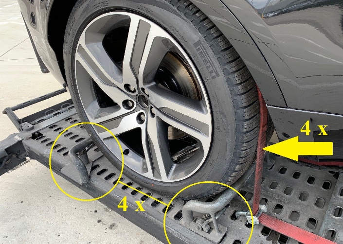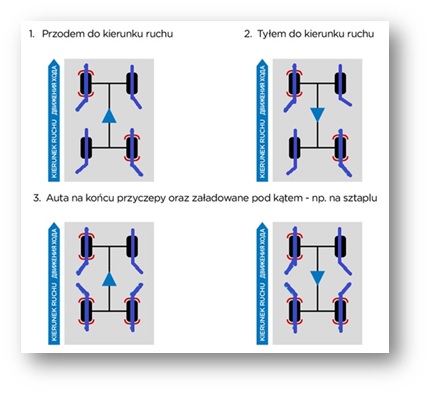 Zabezpieczenie ładunku – co najmniej 4 kliny (po przekątnej), 4 pasy (po jednym na każde koło). Procedura bardziej restrykcyjna niż VDA