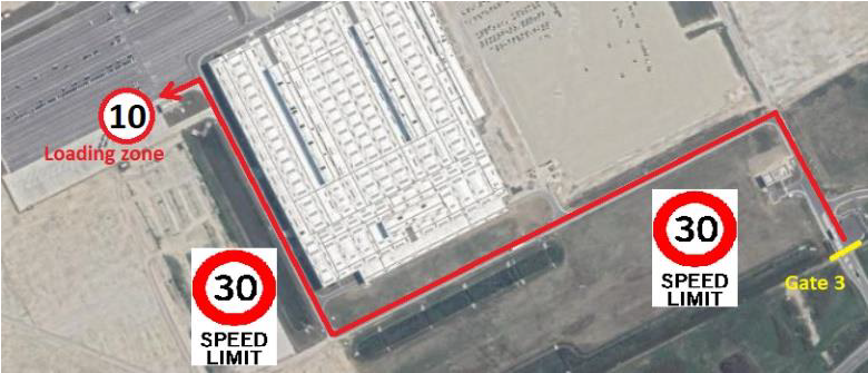NITRA: prędkość za bramą wjazdową nr 3 – 30 km/h, Prędkość na placu załadunkowym – 10 km/h (Obsługa sprawdza prędkość AT aparaturą pomiarową. W przypadku przekroczenia Kierowca zostaje zablokowany!).
