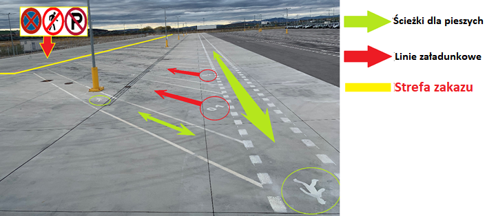 Po zakończeniu załadunku: należy zostawić A/T na miejscu i pieszo udać się biura po dokumenty korzystając tylko z wyznaczonych ścieżek (zakaz poruszania się przed autotransporterami)