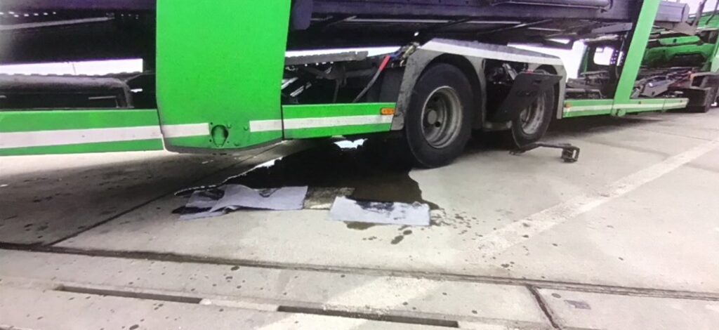 Wyciek oleju lub paliwa: Pojemniki do zbierania oleju są dostępne dla wszystkich kierowców w metalowych stojakach (sprawdź na zdjęciu). Znajdują się one obok boksów parkingowych 5 i 15. Każdy kierowca MUSI zabrać jeden pojemnik zaraz po zaparkowaniu ciężarówki i umieścić go pod ciężarówką na wypadek wycieku oleju. Po zakończeniu załadunku lub manipulacji ciężarówką, kontener MUSI zostać zwrócony na stojak kontenerowy. W przypadku wycieku oleju pojemnik należy przesunąć pod miejsce wycieku, aby zminimalizować rozprzestrzenianie się oleju i wpływ na środowisko. Obowiązkowe korzystanie z tych kontenerów będzie monitorowane przez JLR Business Protection, a ich niewykorzystanie zostanie potwierdzone w oficjalnym protokole (3 zapisy = stały zakaz wstępu na teren JLR