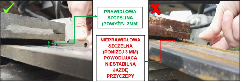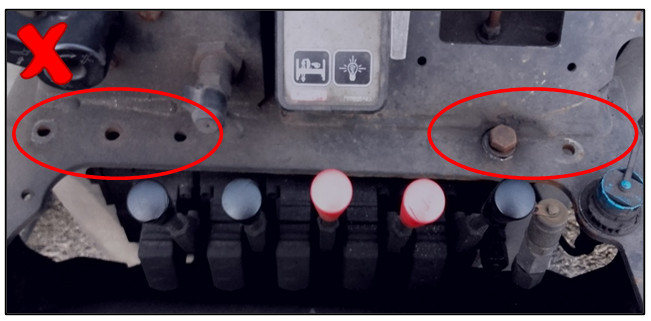Uwaga!!! W lorach typu 100 (np. 1.21 1.23 1.53 itp.) może dojść do zerwania śrub mocujących rozdzielacz hydrauliczny na przyczepie. Po opadnięciu rozdzielacza dochodzi do wciśnięcia dźwigienek co może doprowadzić do powolnego opadania pokładu w trakcie jazdy lub uruchomienia układu opuszczania pokładów po włączeniu pompy przez kierowcę i poważnego uszkodzenia ładunku!!!
