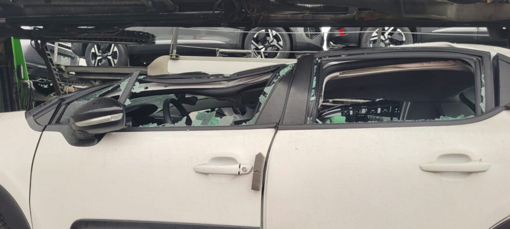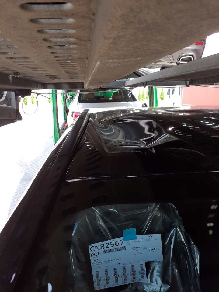 Przykłady uszkodzenia ładunku po włączeniu pompy hydraulicznej z uszkodzonym rozdzielaczem. Zablokowana dźwignia powodowała niekontrolowane opuszczanie górnego pokładu na załadowane na dolnym pokładzie auta i zgniatanie dachów: