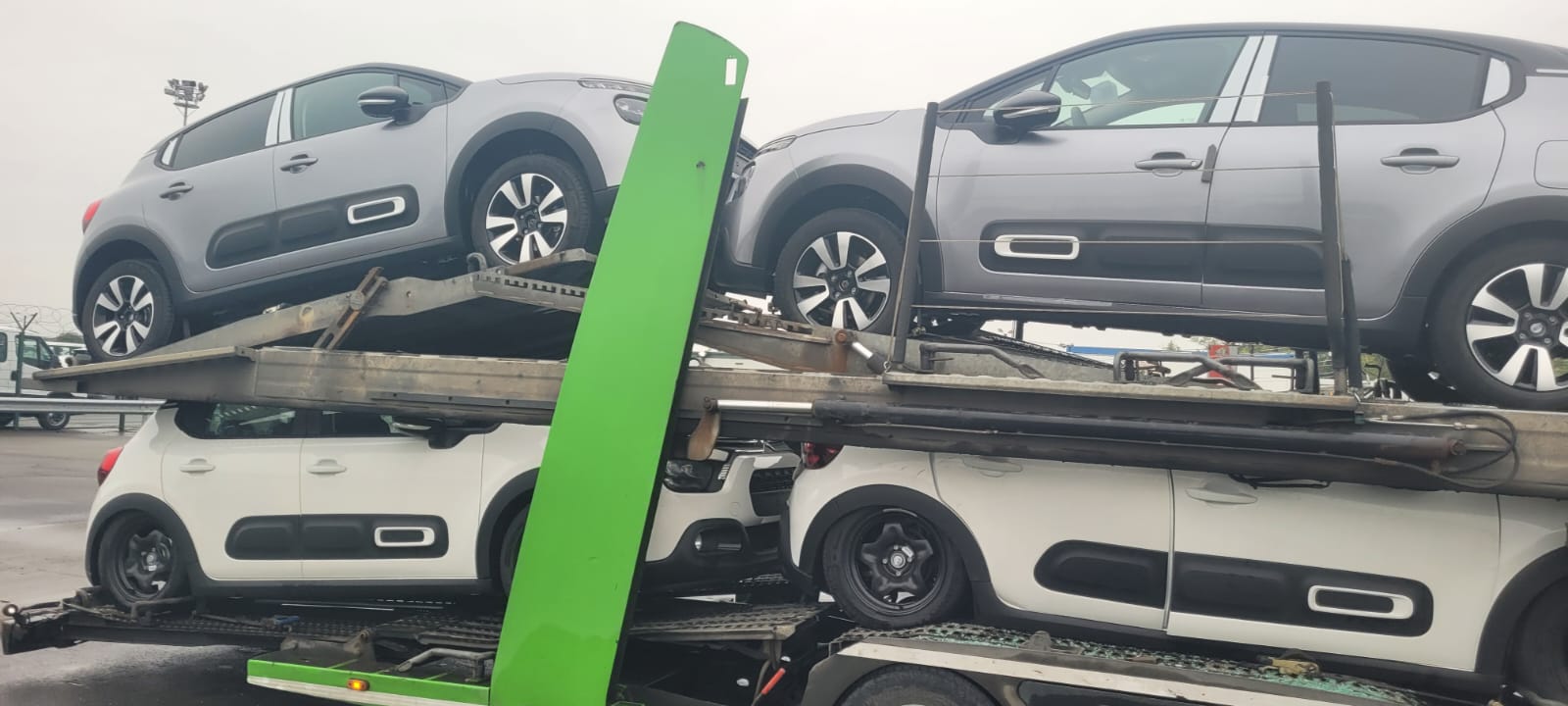 Przykłady uszkodzenia ładunku po włączeniu pompy hydraulicznej z uszkodzonym rozdzielaczem. Zablokowana dźwignia powodowała niekontrolowane opuszczanie górnego pokładu na załadowane na dolnym pokładzie auta i zgniatanie dachów: