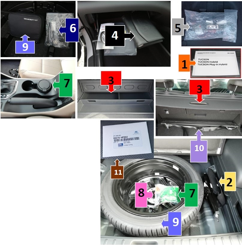 JACK / POCKET, TOOL BOX – podnośnik, klucz do kół, hak, śrubokręt, pokrętło podnośnika.