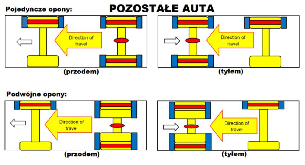 Należy użyć pasy z wydłużonym rękawem (min. 1/2 obwodu koła) oraz w niektórych przypadkach specjalne przedłużane kliny (podwójne koła, konstrukcja autotransportera):