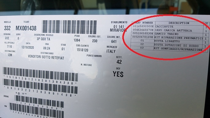 W każdym importowanym modelu samochodu FCA (Fiat, Jeep, Alfa, Lancia, Abarth) przeznaczonym na rynek krajowy musi znajdować się pokrowiec z gaśnicą i trójkątem ostrzegawczym. W samochodach które są produkowane w Tychach (Fiat 500, Abart 500, Jeep Avenger, Lancia Ypsilon) wyposażenie (gaśnica i trójkąt) sprawdzamy zgodnie z naklejką COC (szyba lewa tylna). Jeśli są wpisane na naklejce, to są na wyposażeniu. Pokrowiec znajduje się wewnątrz auta (obok fotelu pasażera) lub należy dołożyć go z kontenera znajdującego się przy liniach załadunkowych.