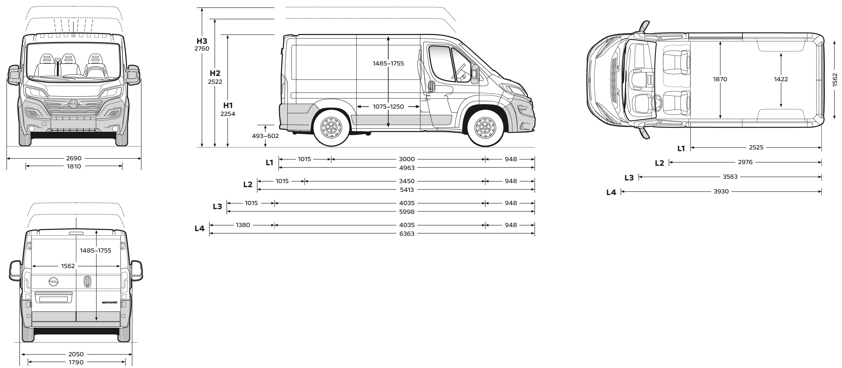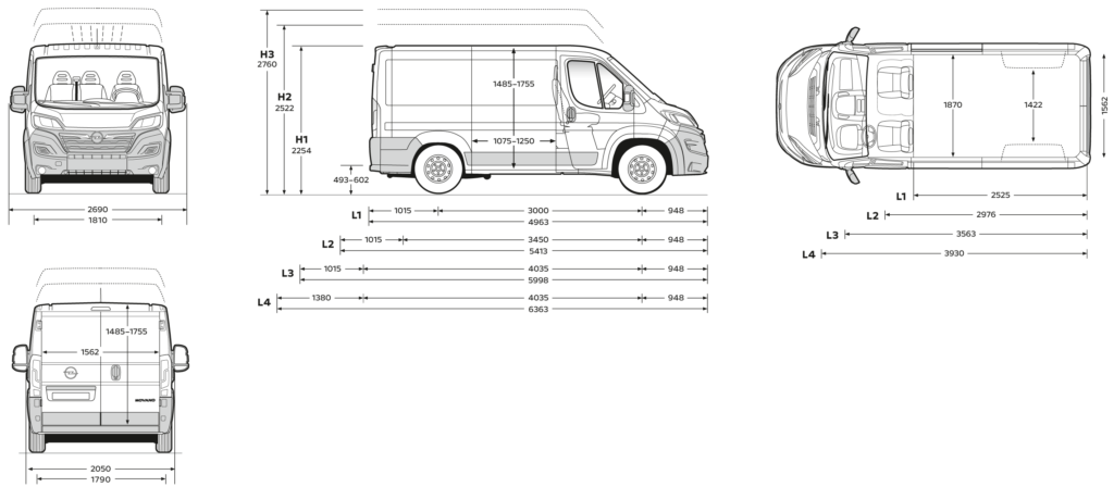 L1, L2, L3, L4 – długości nadwozia Movano, od najkrótszego do najdłuższego.