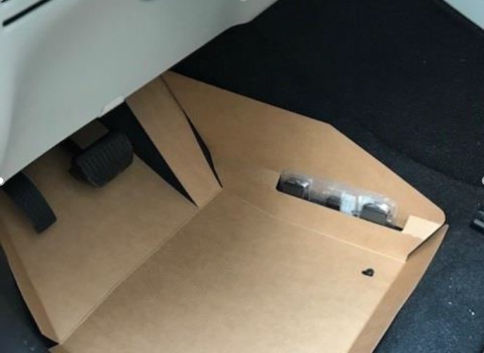 Plastikowy pakiet z kluczami znajduje się w podłodze po stronie kierowcy (zdjęcie po prawej) w kartonowym zabezpieczeniu.