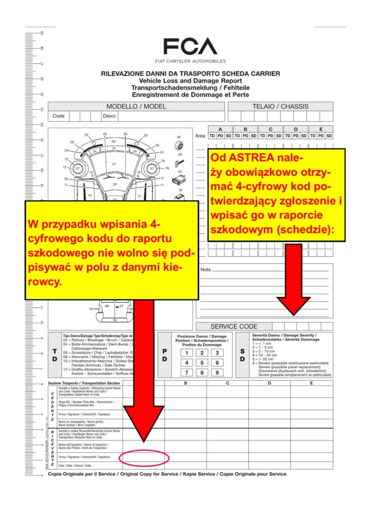 W przypadku sporu pomiędzy zdającym i odbierającym dotyczącego uszkodzenia, kierowca powinien skontaktować się z Astrea. Po rozmowie z Astrea kierowca otrzymuje Service Code, który zostanie wpisany w protokole szkodowym przez pracownika placu.