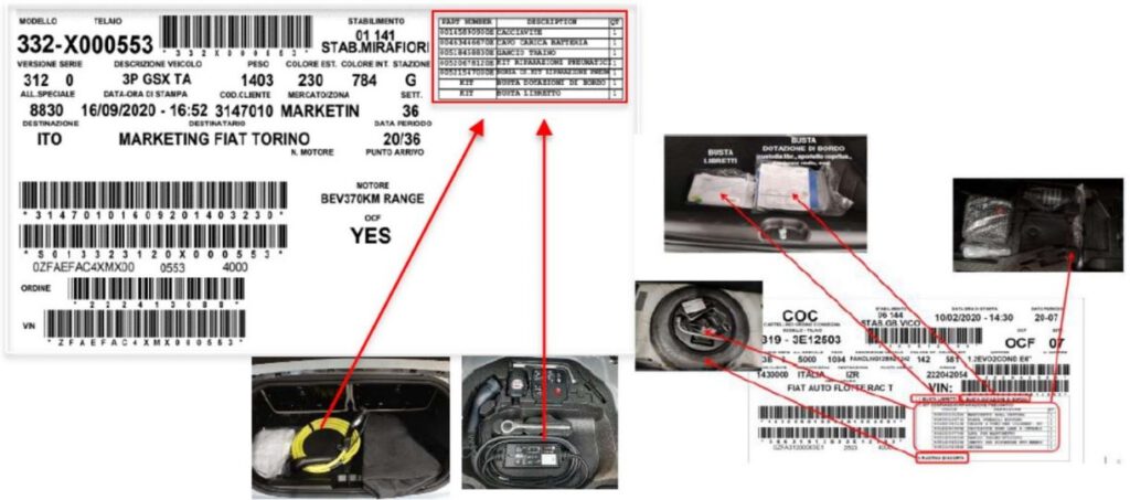 Podczas kontroli należy sprawdzić, jakie elementy są wymienione na naklejce COC (lista wyposażenia) naklejonym na szybę lewych tylnych drzwi. W przypadku gdy w kontrolowanym obszarze znajduje się zaplombowana „Torebka z luźnymi elementami”, należy skontrolować stan torebki i wypisać szkodę transportową jedynie w przypadku gdy brakuje torebki lub jest ona otwarta/ uszkodzona.