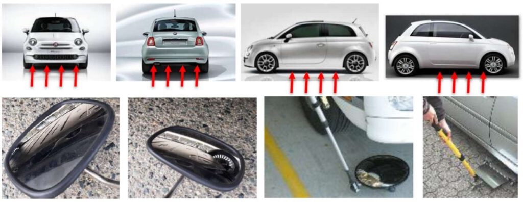Podczas kontroli dozwolone jest schylenie się w celu sprawdzenia progów samochodu. W przypadku pojazdów elektrycznych przeprowadzenie kontroli przy pomocy lusterek teleskopowych jest obowiązkowe w celu kontroli baterii umieszczonej pod podwoziem.