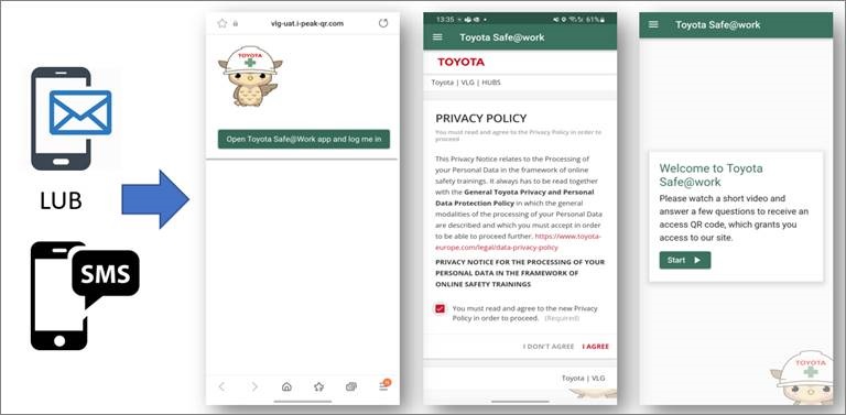 Pobranie aplikacjiSafe@Work po otrzymaniu SMS lub e-mail z linkiem aktywacyjnym (zalecane) / zarejestrowanie się w kioskuna placach Toyoty